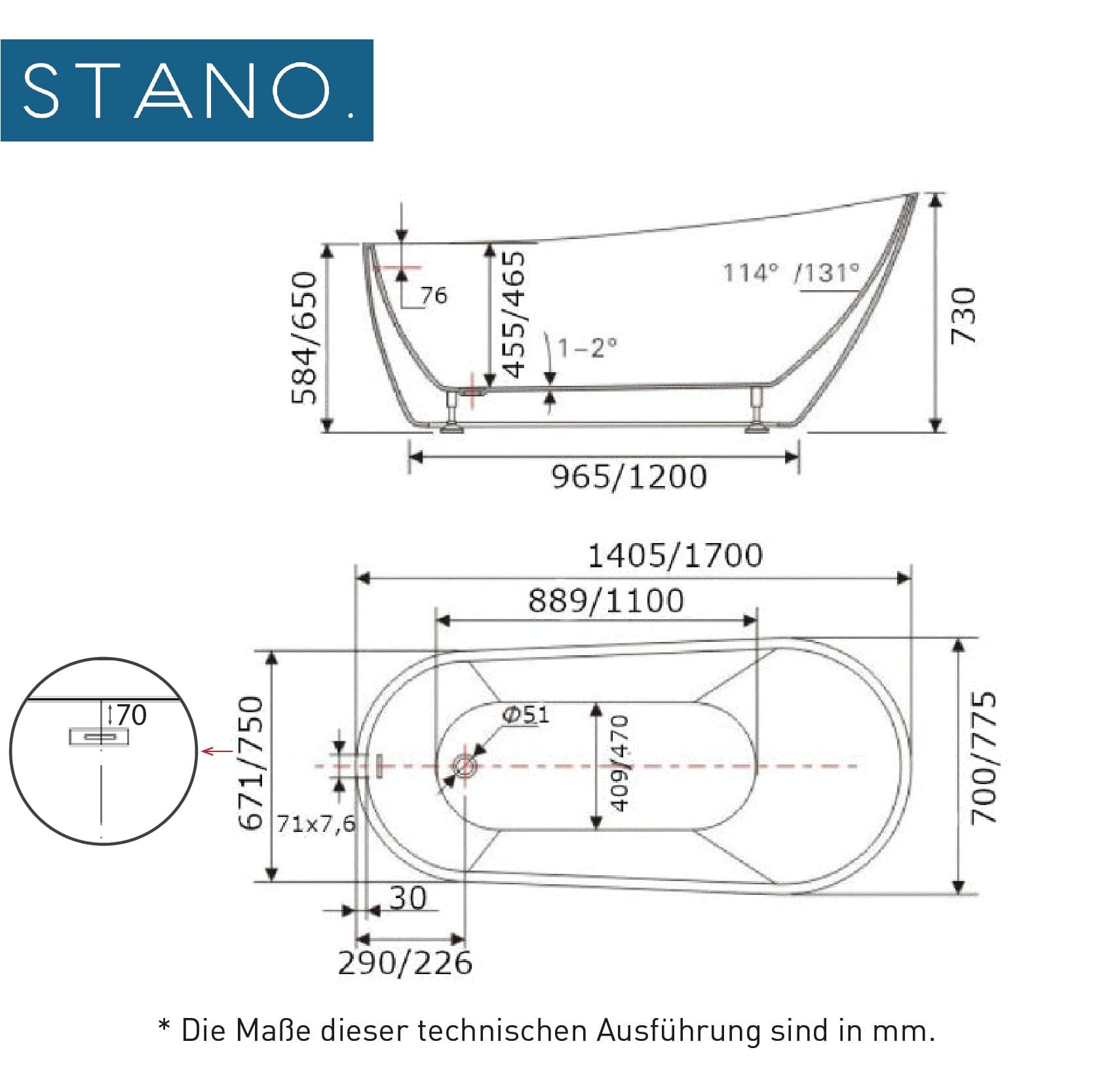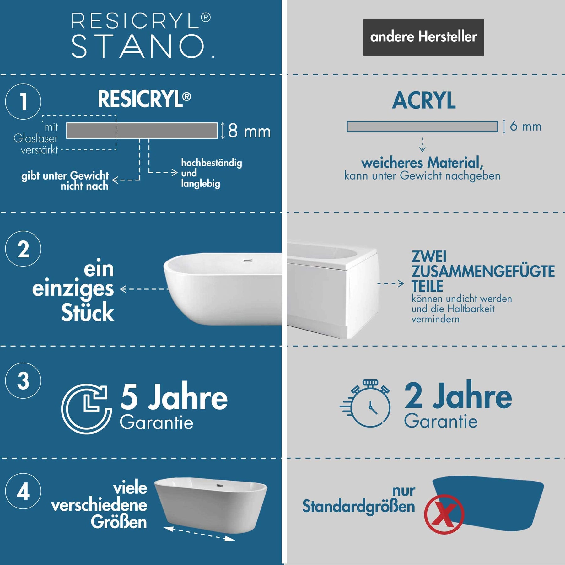 Freistehende Badewanne von STANO. aus hochwertigem Sanitäracryl Resicryl®. Diese badewannen sind besonders solide, langlebig und angenehm im Griff.