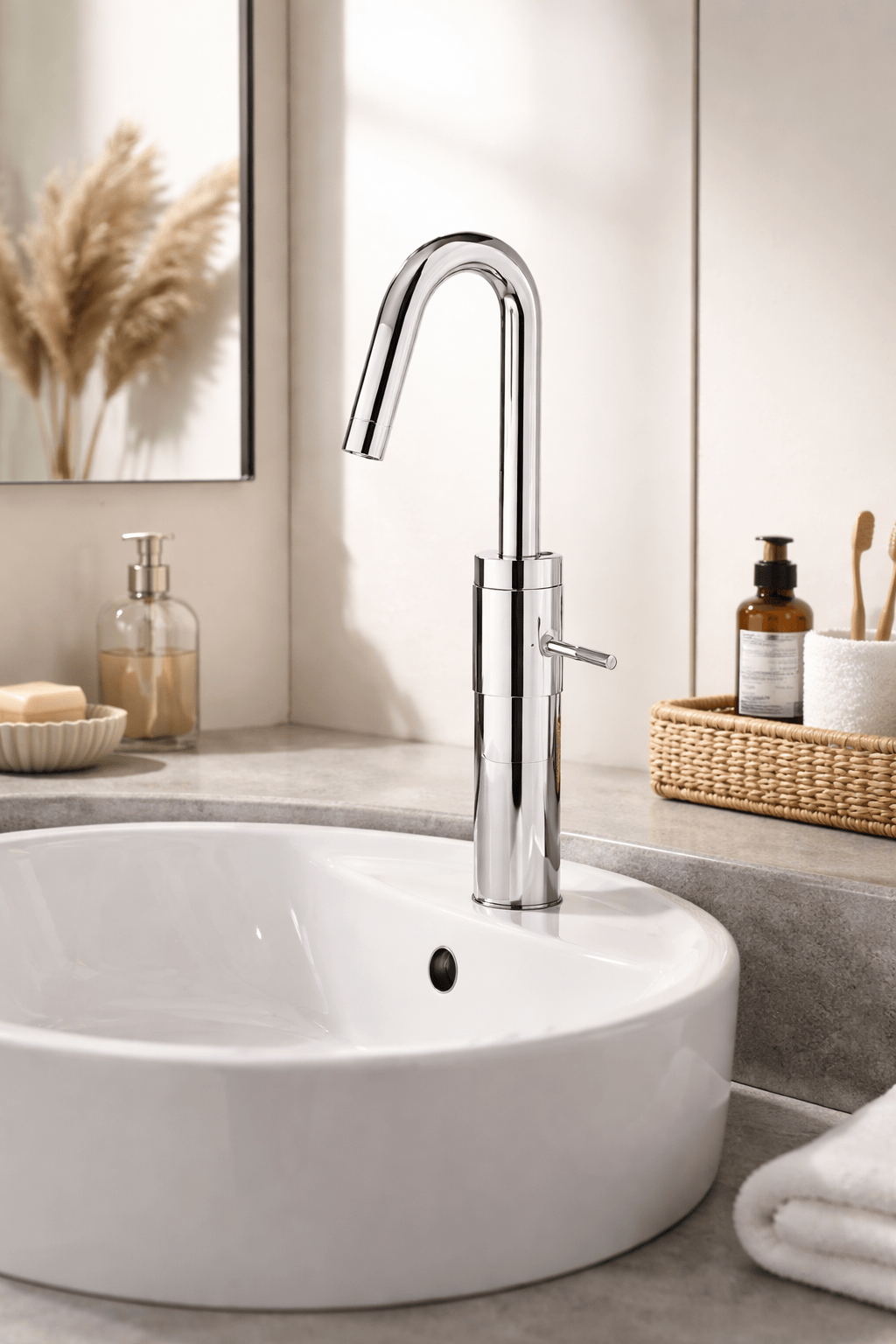 Der CISAL STEP erhöhter Einhebel-Waschtischmischer überzeugt mit modernem Design, hochwertiger Verarbeitung aus massivem Messing und italienischer Qualität. Ideal für Aufsatzwaschbecken und stilvolle Badezimmer mit zeitloser Eleganz