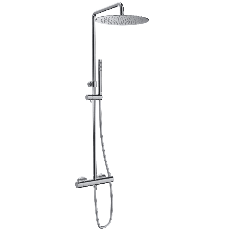 Der Thermostatmischer sorgt für eine konstante und gleichmäßige Wassertemperatur, und der Duschkopf ist groß, um einen hohen Nutzungskomfort zu gewährleisten. Seine Linien sind schlicht und harmonisch, was ihn minimalistisch und ästhetisch ansprechend macht.