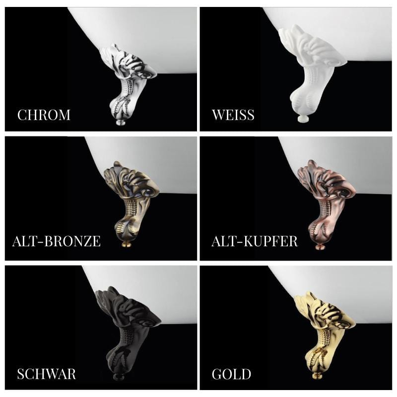 - Farboptionen der Füße: chrom, gold, schwarz, weiß, altkupfer und altbronze