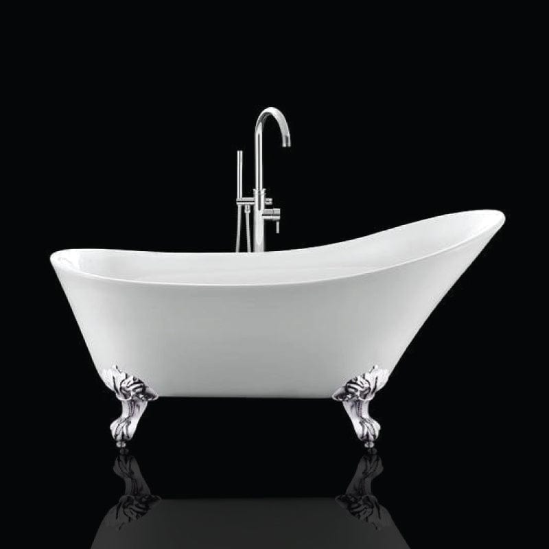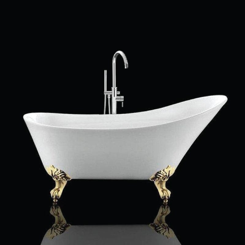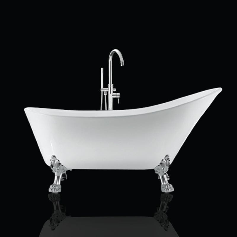 Freistehende Badewanne mit Füßen BALMAIN von Rogier&Mothes, Vintage und Retro inspiriert, Resicryl®, Verbundmaterial aus zwei Schichten hochwertigen Acryls (8 mm) und verstärkt mit widerstandsfähiger Glasfaser, Klauenfüße aus Aluminium, Länge 161 cm.
