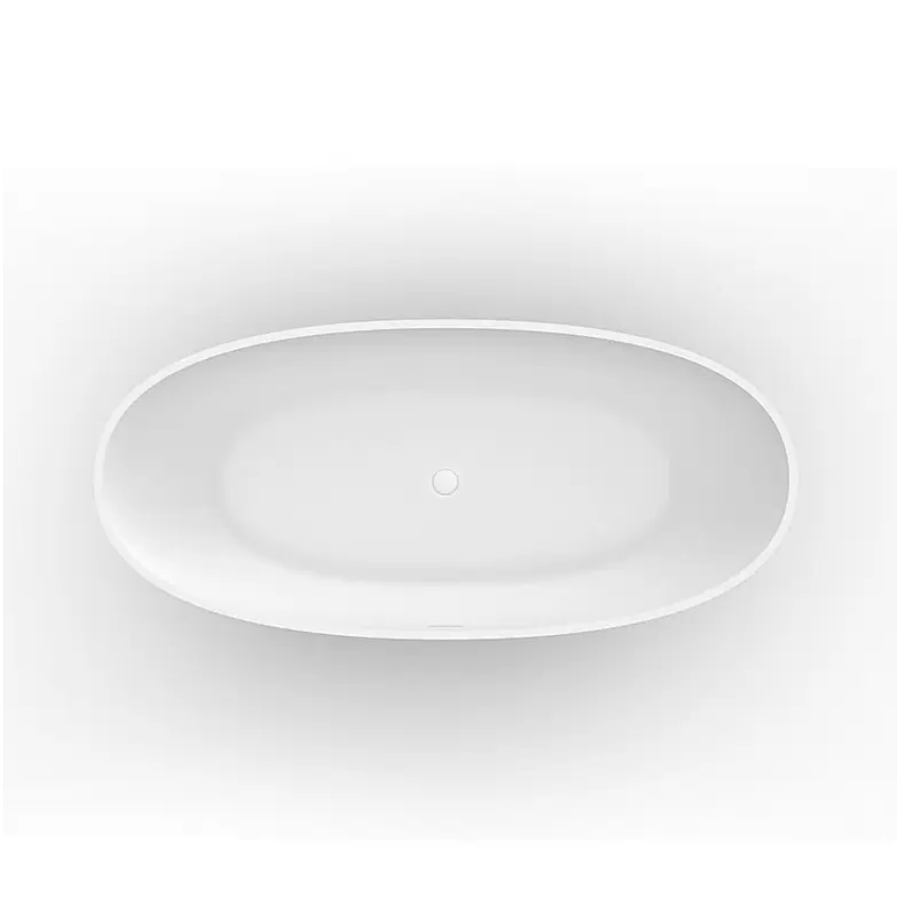 Freistehende Badewanne MALMO aus Mineralguss, der Marke STANO, (Typ Corian®), oval. Minimalistisches Design in Weiß mit mattem Finish. Symmetrische Badewanne mit zentralem Ablauf, Überlauf und Siphon inklusive. Hochwertige Verarbeitung.