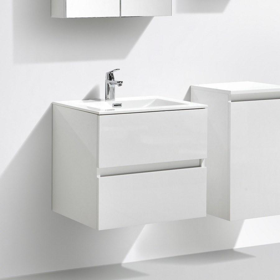 - Unterschrank, hängend, Spanplatte melaminbeschichtet, zwei Schubladen, Hochglanzlack, weiß.
