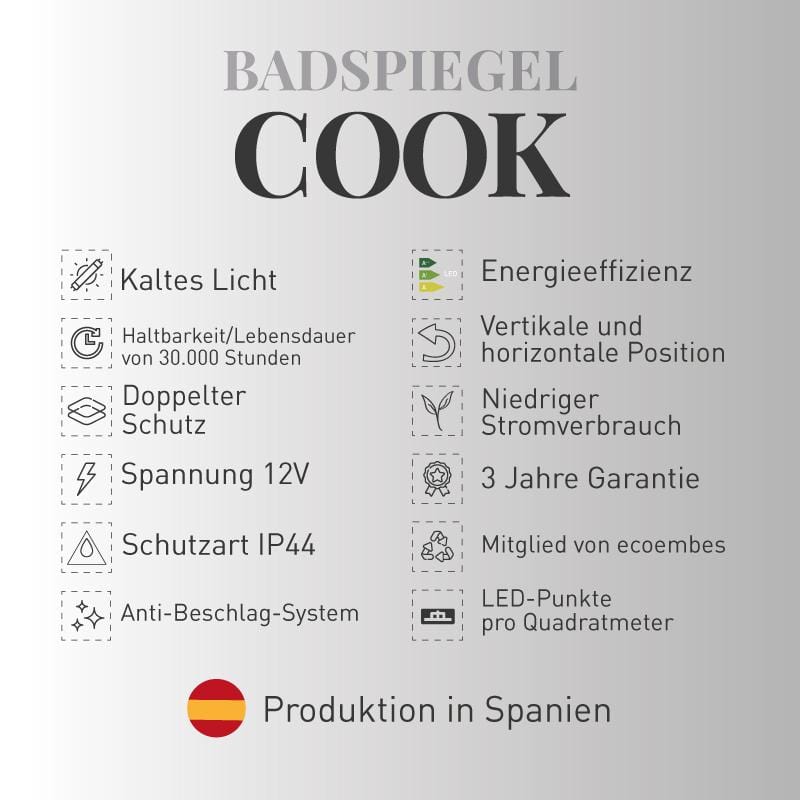 Der Badezimmerspiegel COOK mit integriertem LED-Licht ist das perfekte Element, um Funktionalität und Design zu verbinden. Der Spiegel verfügt über LED-Beleuchtungsstreifen rundherum. Die Farbtemperatur des Lichts ist kalt.