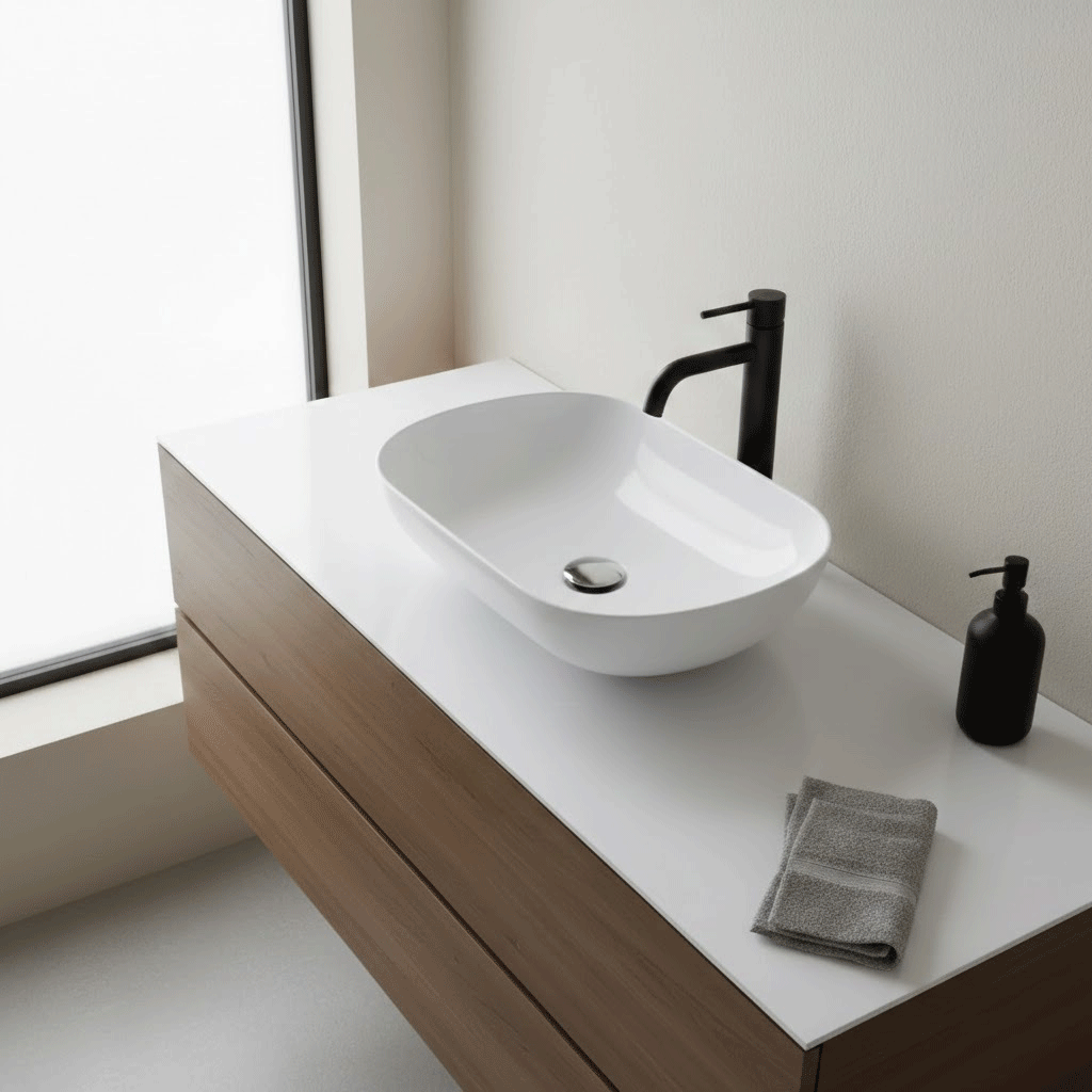 Aufsatzwaschbecken aus Gussmarmor der Marke STANO. Dieses Material zeichnet sich durch seine hohe Widerstandfähigkeit aus. Sein Seidenglanz verleiht ihm eine bemerkenswerte Eleganz. Modernes, minimalistisches Design.