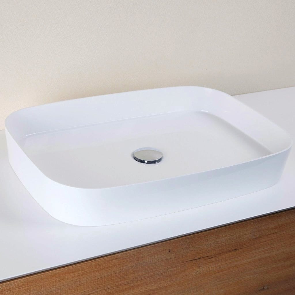 Aufsatzwaschbecken aus Gussmarmor der Marke STANO. Dieses Material zeichnet sich durch seine hohe Widerstandfähigkeit aus. Sein Seidenglanz verleiht ihm eine bemerkenswerte Eleganz. Modernes, minimalistisches Design.