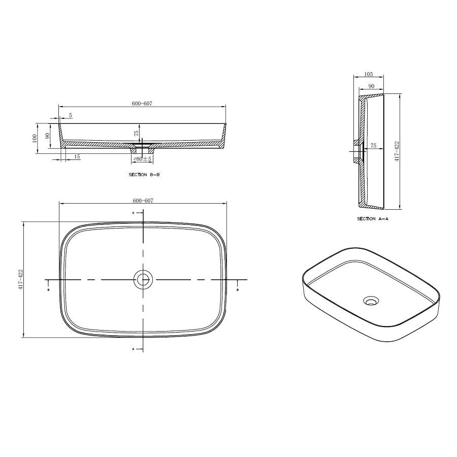 Dieses Waschbecken besitzt keinen Überlauf. Es sollte ein Ablaufventil für Waschbecken ohne Überlauf installiert werden ( siehe Ventile und Siphons).