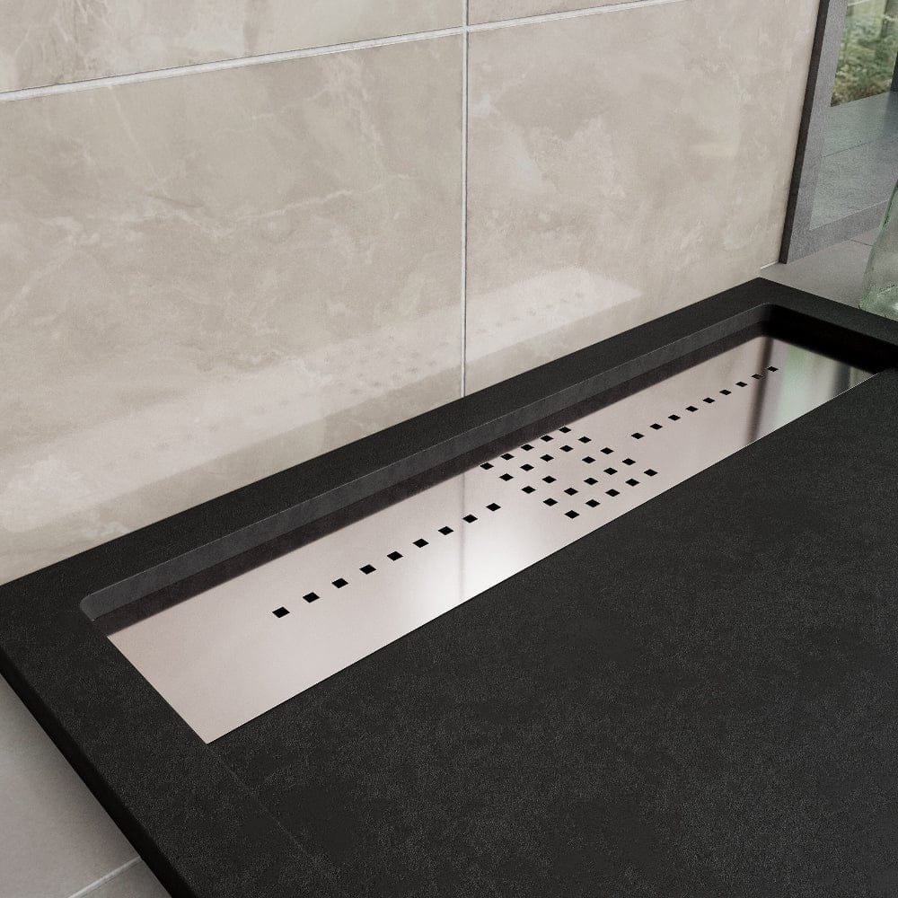 Extra flache Duschwanne ORION für eine ultramoderne italienische Dusche. Bei dieser Duschwanne ist der Wasserablauf von allen vier Seiten gesehen mittig platziert.